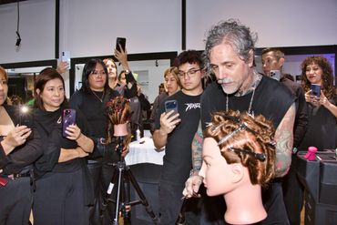 Por la mañana, los asistentes escucharon atentamente la filosofía de Rudy: la peluquería como escenario de identidad, el corte que se adapta al cliente y el color que mejora la luz del rostro. Cada frase dejaba un guiño hacia la técnica y hacia la emoción. Con Domingo Del Moral habilitando el diálogo en español, la conexión fue inmediata: “Transformar lo invisible en visible”, decía Rudy, “hacer que cada cliente sienta su imagen propia”.
